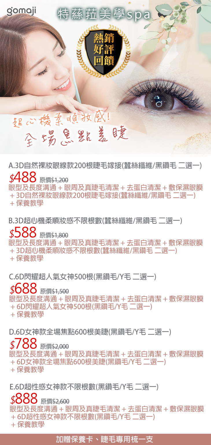 〈眼型及長度溝通 + 眼周及真睫毛清潔 + 去蛋白清潔 + 敷保濕眼膜 + 6D超性感女神款不限根數(黑鑽毛/Y毛 二選一) + 保養教學〉加贈保養卡、睫毛專用梳一支