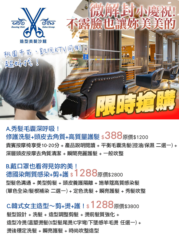 A.秀髮毛囊深呼吸!修護洗髮+頭皮去角質+高質量護髮 / B.戴口罩也看得見妳的美!德國染劑質感染+剪+護 / C.韓式女主造型~剪+燙+護!