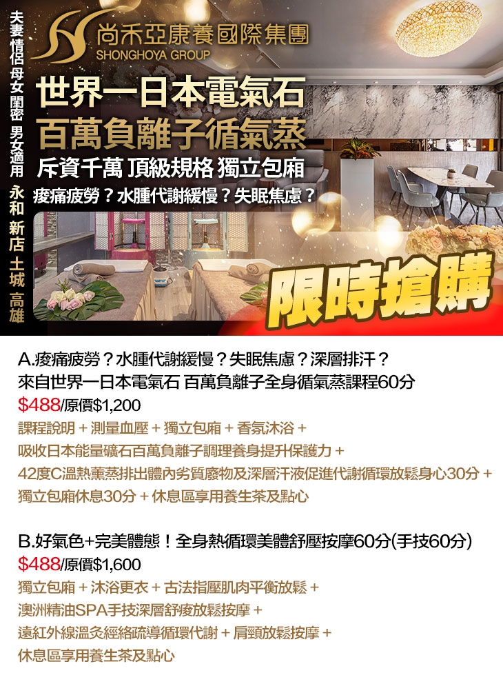 A.痠痛疲勞?水腫代謝緩慢?失眠焦慮?深層排汗?來自世界一日本電氣石 百萬負離子全身循氣蒸課程60分 / B.好氣色+完美體態!全身熱循環美體舒壓按摩60分(手技60分)
