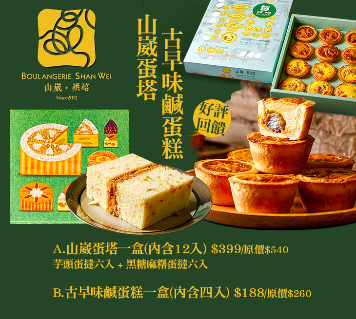 A.山崴蛋塔一盒(內含12入) 〈芋頭蛋撻六入 + 黑糖麻糬蛋撻六入〉