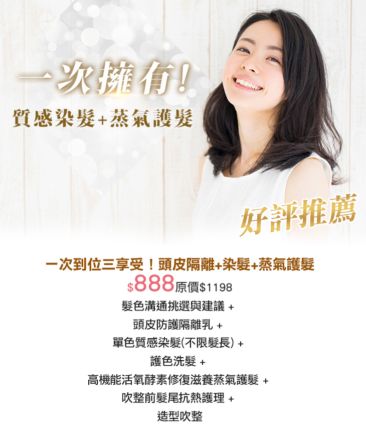 髮色溝通挑選與建議 + 頭皮防護隔離乳 + 單色質感染髮(不限髮長) + 護色洗髮 + 高機能活氧酵素修復滋養蒸氣護髮 + 吹整前髮尾抗熱護理 + 造型吹整