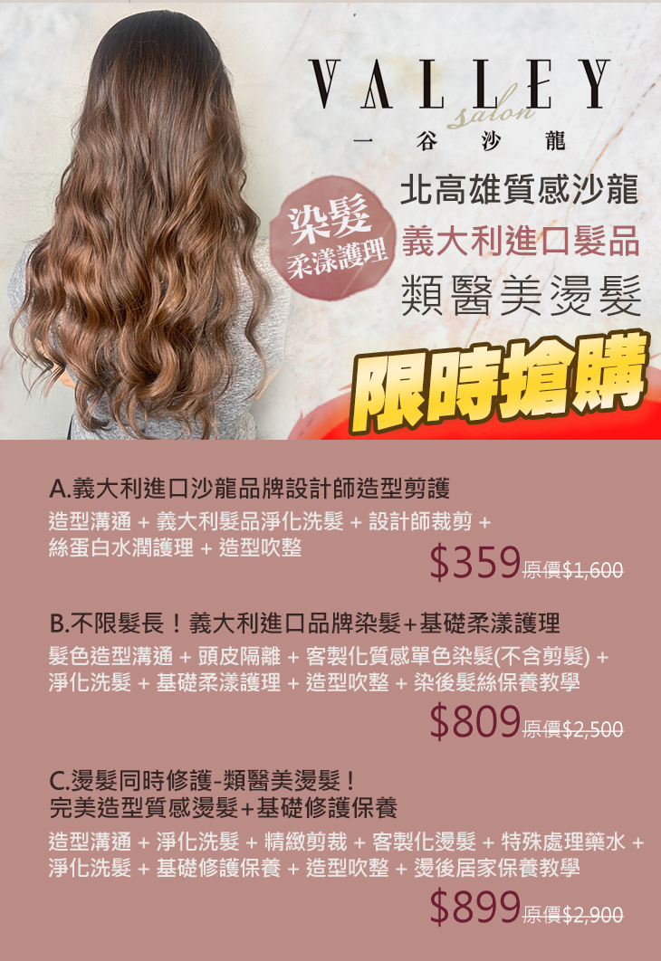 A.義大利進口沙龍品牌設計師造型剪護 / B.不限髮長!義大利進口品牌染髮+基礎柔漾護理 / C.燙髮同時修護-類醫美燙髮 ! 完美造型質感燙髮+基礎修護保養