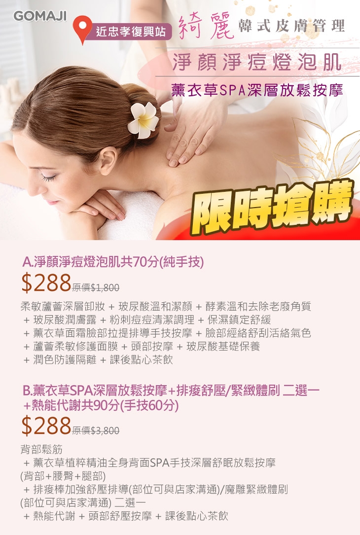B.薰衣草SPA深層放鬆按摩+排痠舒壓/緊緻體刷 二選一+熱能代謝共90分(手技60分)