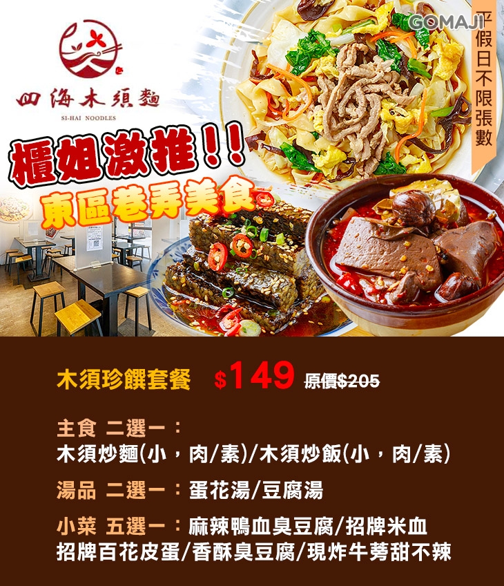 深受不少顧客喜愛的「四海木須麵」,店內食材皆經過精心挑選,透過廚師的好手藝幻化成一道道美味的小品佳餚,熱騰騰入口,精華滋味瞬間從味蕾逐漸延伸到胃腸,最後深植人心,每一口都是最棒的享受!店家秉持著「以人為本」的精神,堅持用100%努力做到最好,希望讓每一位客人品嚐到最優質、最健康的滿分料理,比起大餐廳裡的名貴珍餚,一份充滿台灣味的木須炒麵,或者一碗簡單的暖心湯品,才是最令人難忘、回味無窮的好味道!還沒來過這間店的麻吉,不妨相約親友一起品嚐四海的好滋味吧!