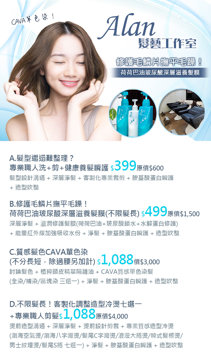 A.髮型邋遢難整理?專業職人洗+剪+健康養髮瞬護 / B.修護毛鱗片撫平毛躁!荷荷巴油玻尿酸深層滋養髮膜(不限髮長) / C.質感髮色CAVA單色染(不分長短,除過腰另加計) / D.不限髮長!客製化調整造型冷燙七選一+專業職人剪髮