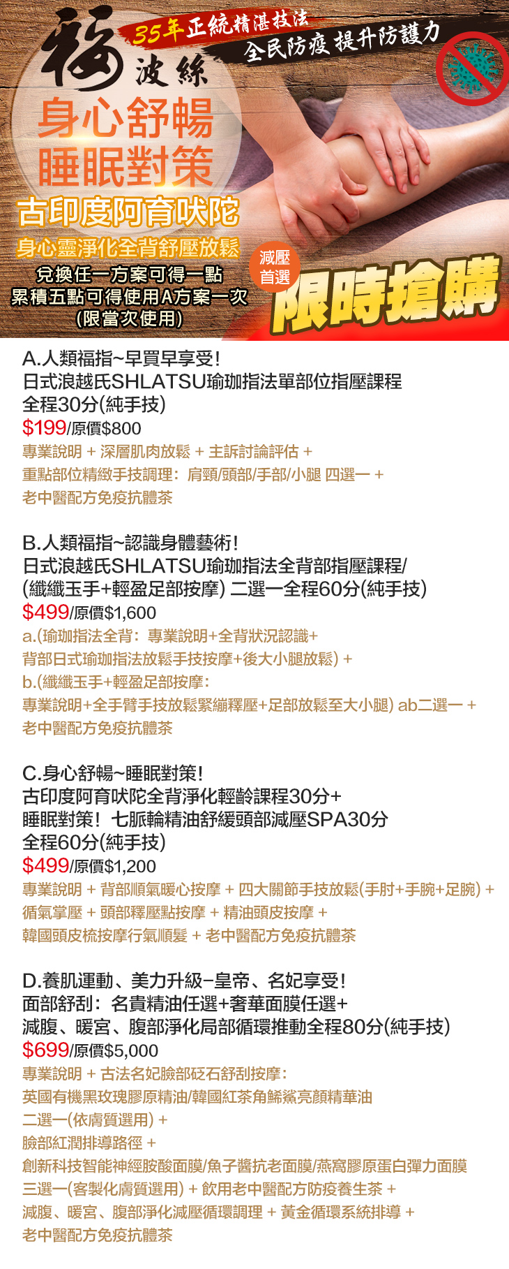 A.早買早享受!日式浪越氏SHLATSU瑜珈指法單部位指壓課程全程30分(純手技) / B.認識身體藝術!日式浪越氏SHLATSU瑜珈指法全背部指壓課程/(纖纖玉手+輕盈足部按摩) 二選一全程60分(純手技) / C.身心舒暢~睡眠對策!古印度阿育吠陀全背淨化輕齡課程30分+睡眠對策!七脈輪精油舒緩頭部減壓SPA30分全程60分(純手技) / D.養肌運動!面部舒刮:名貴精油任選+奢華面膜任選+減腹、暖宮、腹部淨化局部循環推動全程80分(純手技)