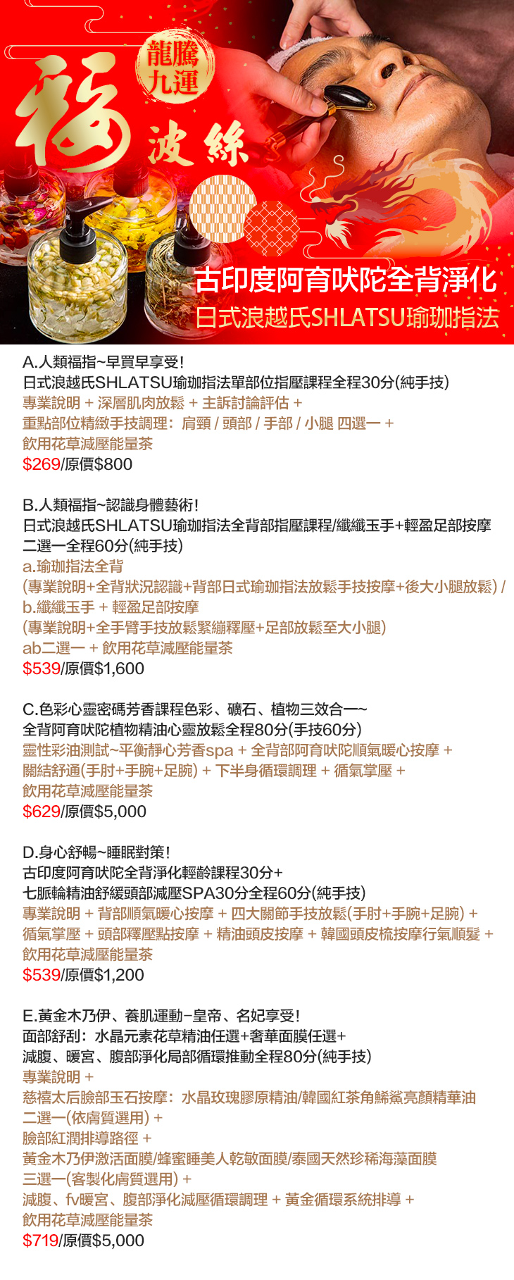 A.日式浪越氏SHLATSU瑜珈指法單部位指壓課程全程30分/B.日式浪越氏SHLATSU瑜珈指法全背部指壓課程/(纖纖玉手+輕盈足部按摩)二選一全程60分/C.色彩心靈密碼芳香課程色彩、礦石、植物三效合一~全背阿育吠陀植物精油心靈放鬆全程80分/D.身心舒暢~睡眠對策!古印度阿育吠陀全背淨化輕齡課程30分+七脈輪精油舒緩頭部減壓SPA30分全程60分/E.面部舒刮:水晶元素花草精油任選+奢華面膜任選+減腹、暖宮、腹部淨化局部循環推動全程80分
