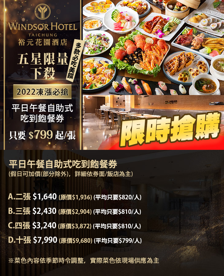 【台中五星級酒店-裕元花園酒店-溫莎咖啡廳】感謝麻吉們熱烈搶購,已全數賣光光。