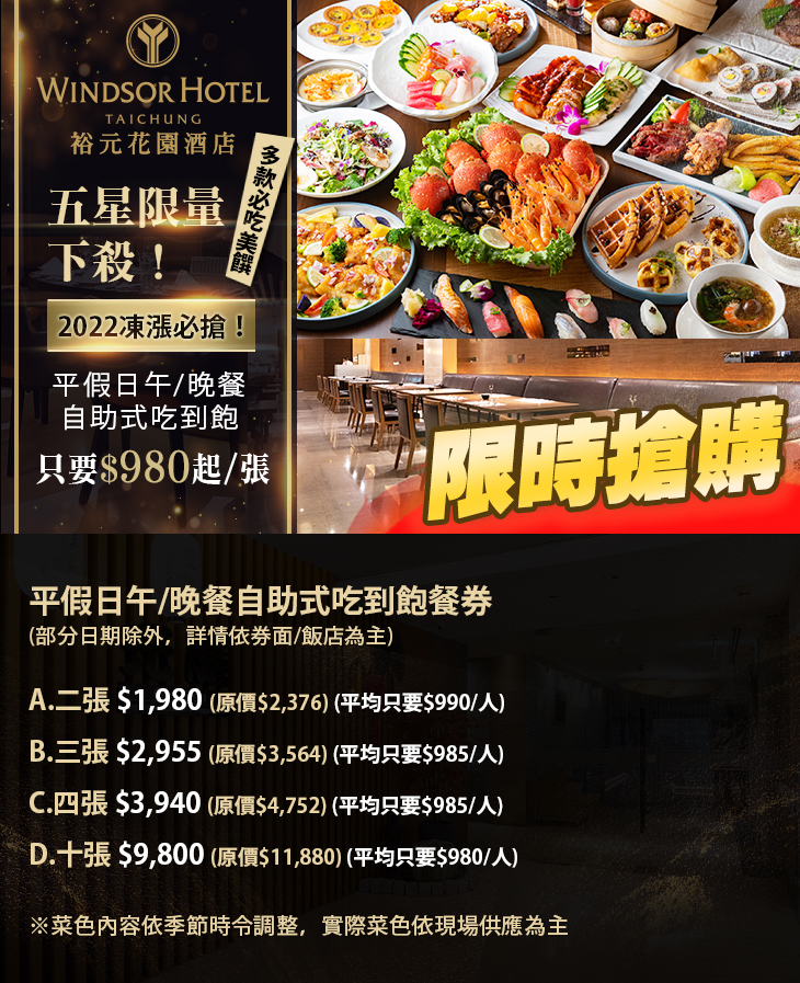 溫莎咖啡廳在裕元花園酒店地下一樓,環境奢華舒適,給您前所未有的頂級五感享受;主廚團隊嚴選當令食材搭配各地蔬食,烹調出各式異國料理多款美饌、歐式甜點及特色飲品,豐富的菜色點綴了餐桌的繽紛,準備好來一場精采絕倫的美食饗宴了嗎?趕緊趁著2022年調漲後,把握這一波超值優惠方案,享受專屬於年末的奢華聚餐,攜家帶眷前來大快朵頤一番!錯過不再、手刀搶購!
