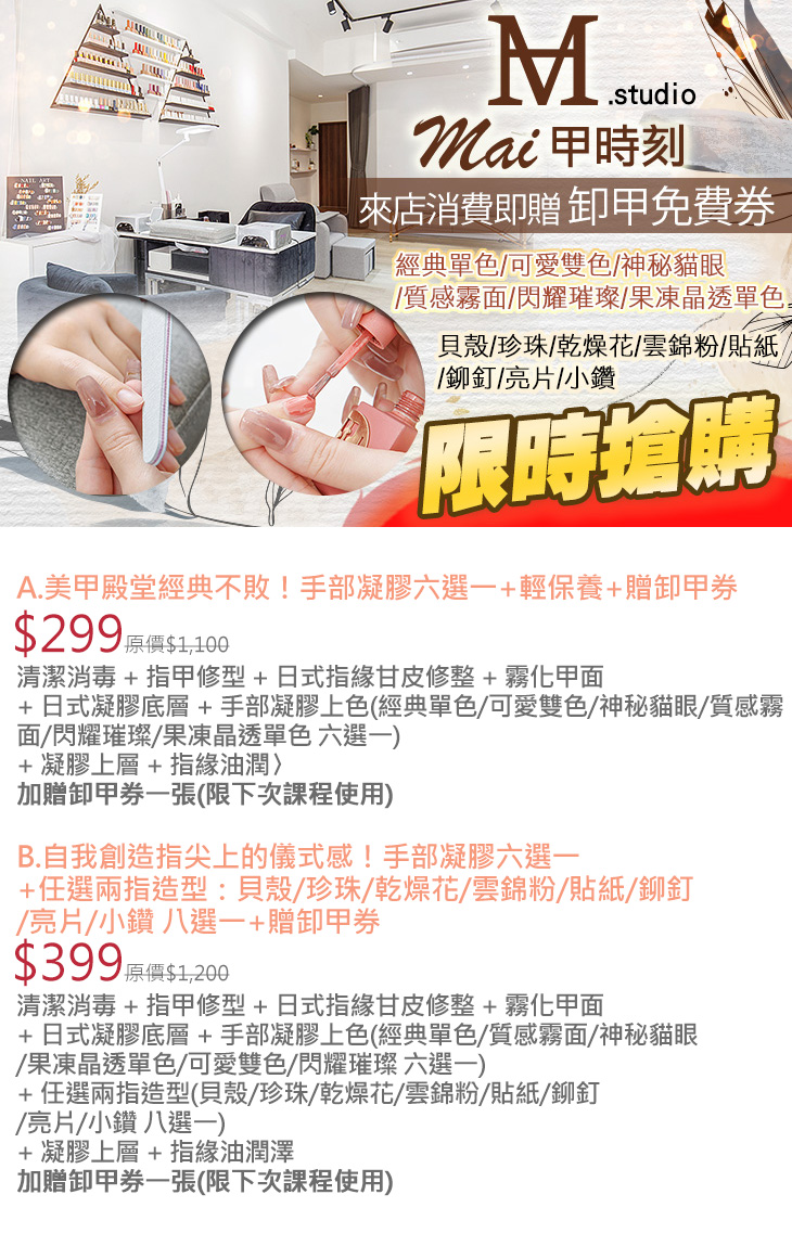 A.美甲殿堂經典不敗!手部凝膠六選一+輕保養+贈卸甲券 / B.自我創造指尖上的儀式感!手部凝膠六選一+任選兩指造型:貝殼/珍珠/乾燥花/雲錦粉/貼紙/鉚釘/亮片/小鑽 八選一+贈卸甲券