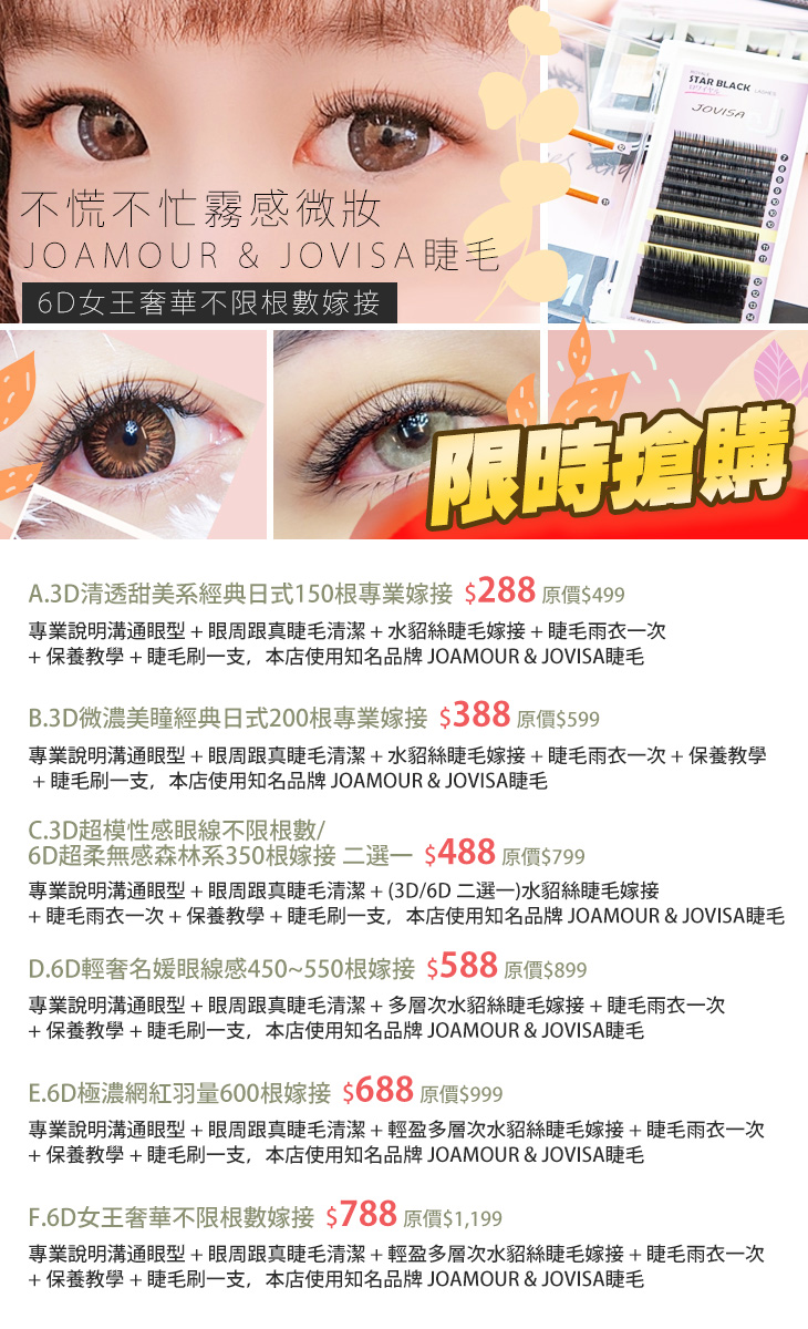 A.3D清透甜美系經典日式150根專業嫁接 / B.3D微濃美瞳經典日式200根專業嫁接 / C.3D超模性感眼線不限根數/6D超柔無感森林系350根嫁接 二選一 / D.6D輕奢名媛眼線感450~550根嫁接 / E.6D極濃網紅羽量600根嫁接 / F.6D女王奢華不限根數嫁接
