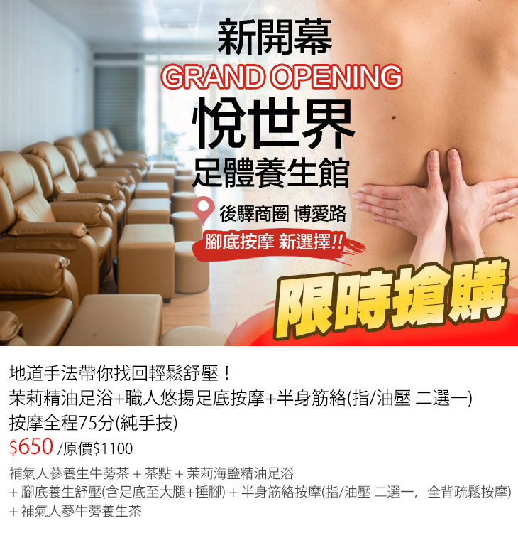 【悅世界足體養生館】感謝麻吉們熱烈搶購,已全數賣光光。