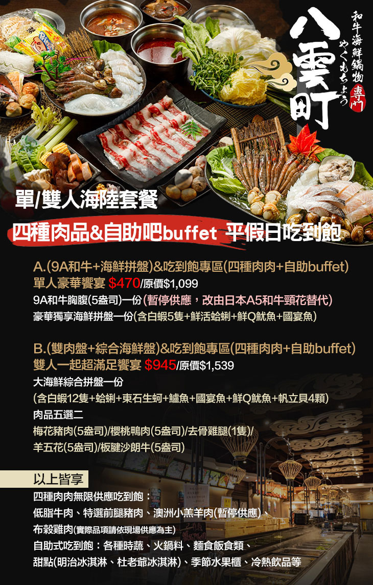 A.(9A和牛+海鮮拼盤)&吃到飽專區(四種肉肉+自助buffet)單人豪華饗宴 / B.(雙肉盤+綜合海鮮盤)&吃到飽專區(四種肉肉+自助buffet)雙人一起超滿足饗宴