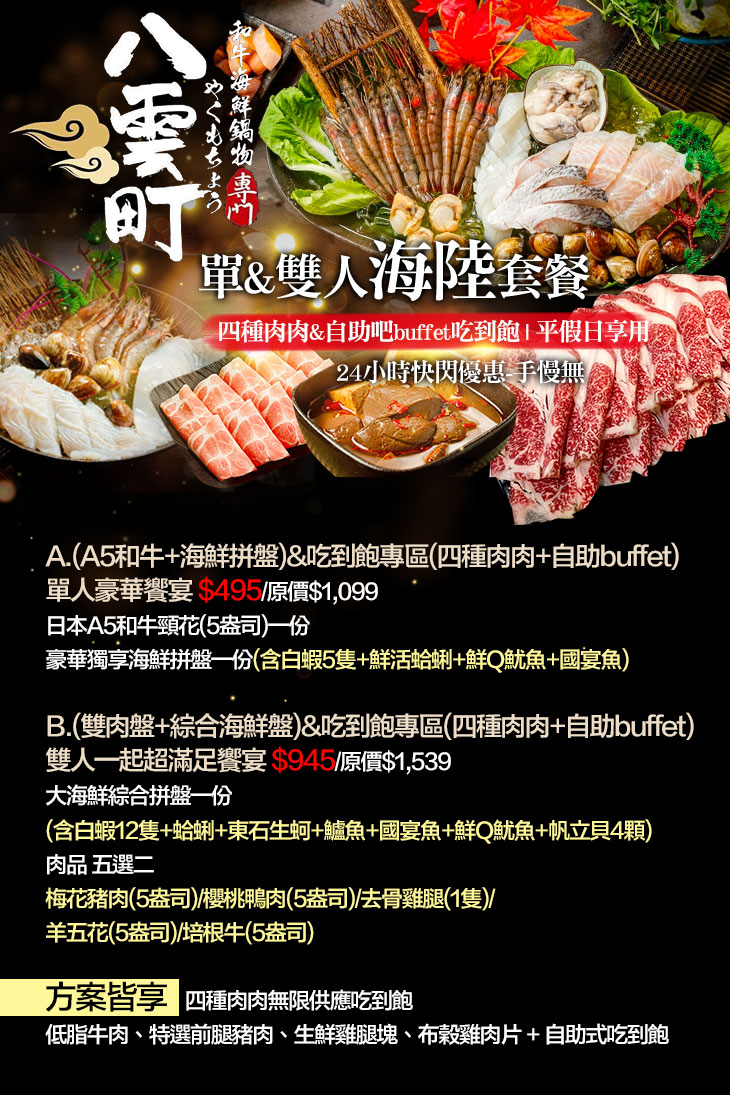 A.(A5和牛+海鮮拼盤)&吃到飽專區(四種肉肉+自助buffet)單人豪華饗宴 / B.(雙肉盤+綜合海鮮盤)&吃到飽專區(四種肉肉+自助buffet)雙人一起超滿足饗宴