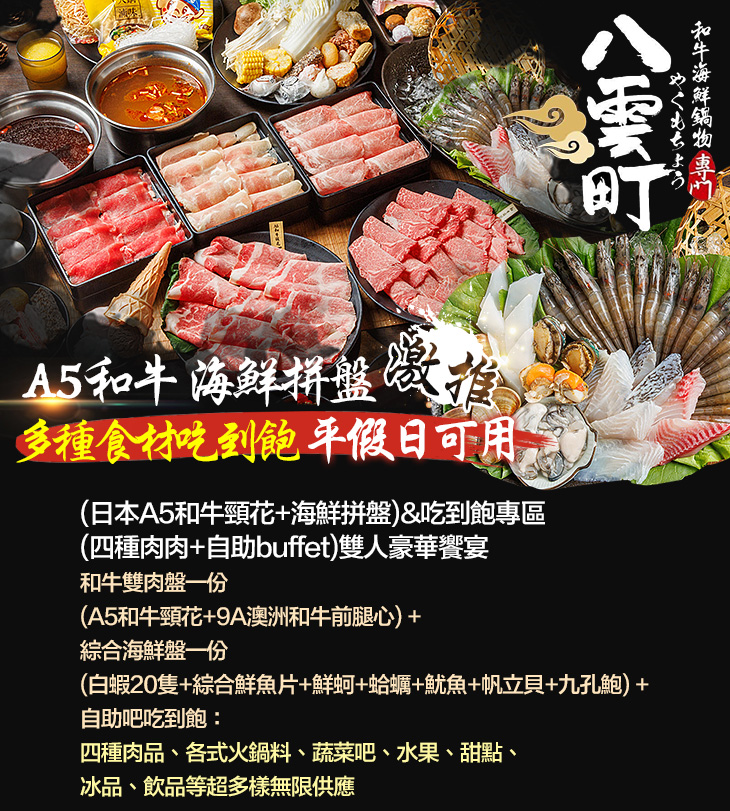 〈和牛雙肉盤一份(A5和牛頸花+9A澳洲和牛前腿心) + 綜合海鮮盤一份(白蝦20隻+綜合鮮魚片+鮮蚵+蛤蠣+魷魚+帆立貝+九孔鮑) + 自助吧吃到飽:四種肉品、各式火鍋料、蔬菜吧、水果、甜點、冰品、飲品等超多樣無限供應〉