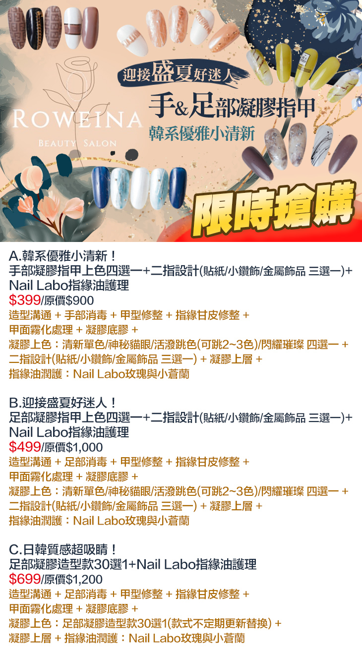 A.韓系優雅小清新!手部凝膠指甲上色四選一+二指設計(貼紙/小鑽飾/金屬飾品 三選一)+Nail Labo指緣油護理 / B.迎接盛夏好迷人!足部凝膠指甲上色四選一+二指設計(貼紙/小鑽飾/金屬飾品 三選一)+Nail Labo指緣油護理 / C.日韓質感超吸睛!足部凝膠造型款30選1+Nail Labo指緣油護理