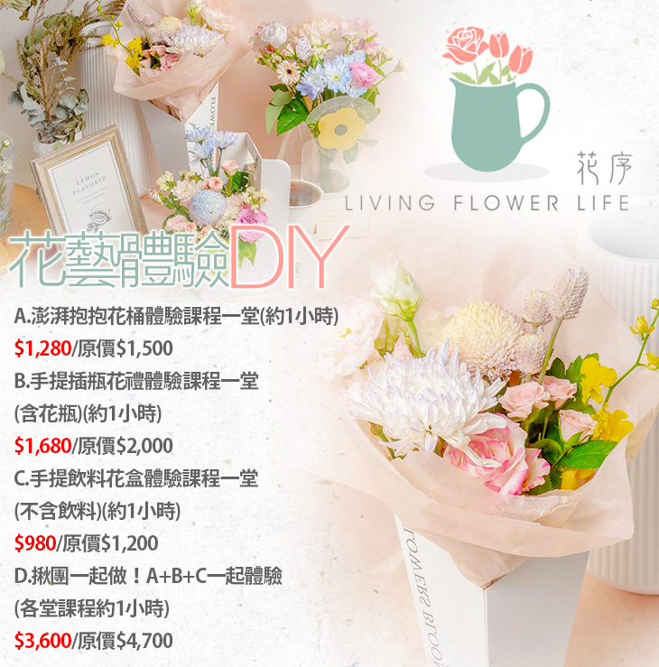 體驗化身一日花藝師吧!把迷人的花花草草帶入你生活的場所,細細品味一草一木,享受手作過程的純淨美好,這回,跟著花序 living flower life,陶醉其中吧!