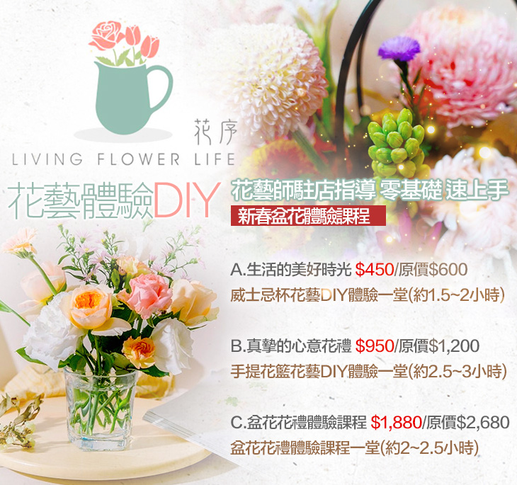 體驗化身一日花藝師吧!把迷人的花花草草帶入你生活的場所,細細品味一草一木,享受手作過程的純淨美好,這回,跟著花序 living flower life,陶醉其中吧!