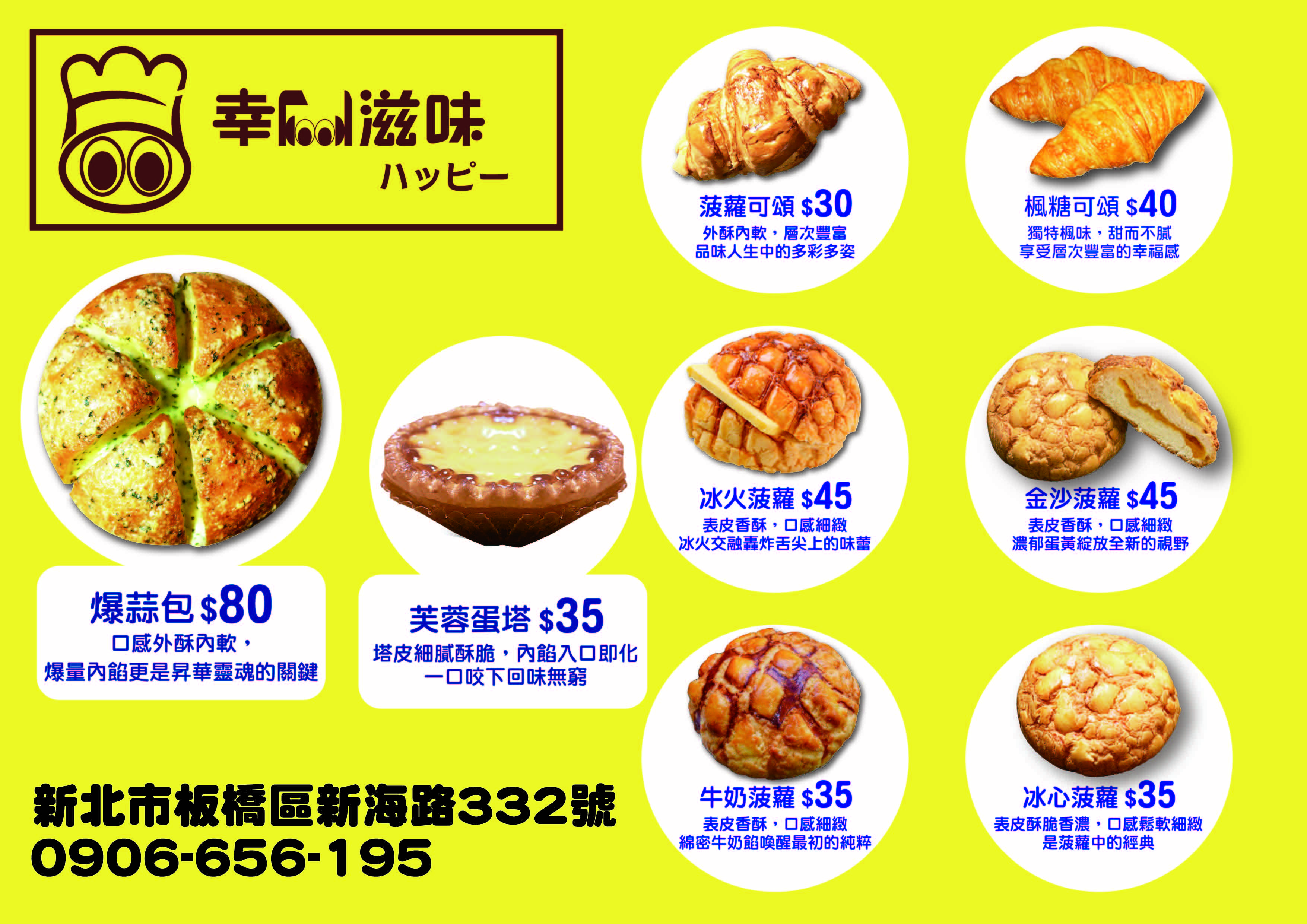 客人好評不斷,發燒中!【幸food滋味】主要販售現烤出爐的爆蒜包、芙蓉蛋塔、楓糖可頌、冰火菠蘿等各式烘焙點心,創辦人因為想念阿嬤小時候做的麵包,想要藉由麵包,來傳達她對阿嬤的思念,因而選擇開了這間麵包店——幸food滋味。希望這份不失溫度的美味,可以療癒你的生活,帶給你滿滿的幸福與飽足!
