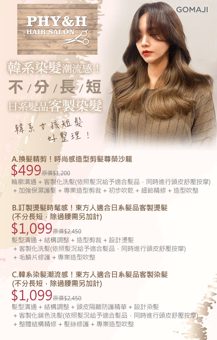 A.換髮精剪!時尚感造型剪髮尊榮沙龍 / B.訂製燙髮時髦感!東方人適合日系髮品客製燙髮(不分長短,除過腰需另加計) / C.韓系染髮潮流感!東方人適合日系髮品客製染髮(不分長短,除過腰需另加計)