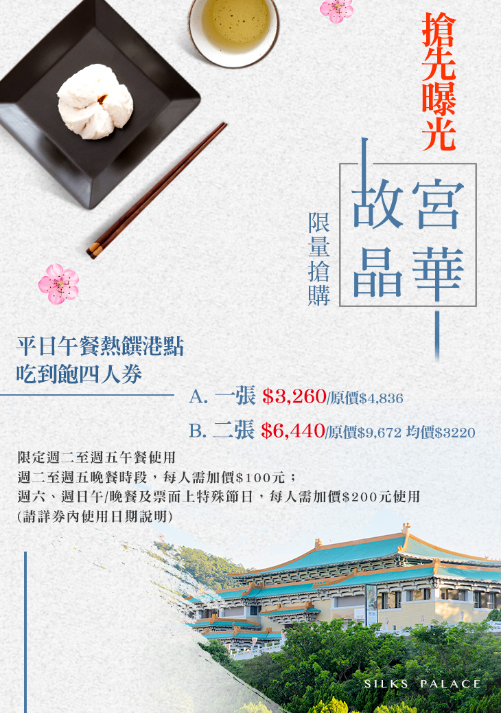 搶先曝光!故宮晶華熱饌港點吃到飽平日午餐熱饌港點吃到飽四人券(限定週二至週五午餐使用(週二至週五晚餐時段,每人需加價$100元;週六、週日午/晚餐及票面上特殊節日,每人需加價$200元使用)(請詳券內使用日期說明)