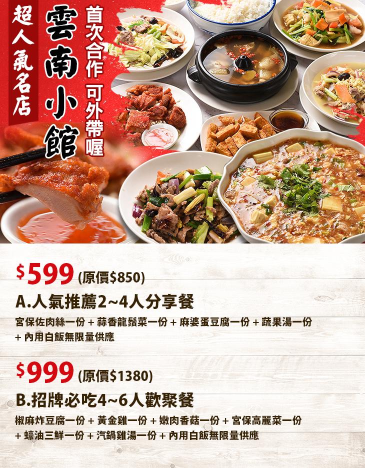 超人氣名店!首次合作!秉持用料實在、食材新鮮原則,樣樣都是店家遵循獨門配方、用心烹煮而成,為了完美展現風味道地的雲泰佳餚,保證每一口都能滿足您我挑剔的味蕾,宛如身處異地,帶著舌尖遨遊一場美食之旅;在這裡,不僅能讓您食得飽足又滿意,更安心無慮唷!