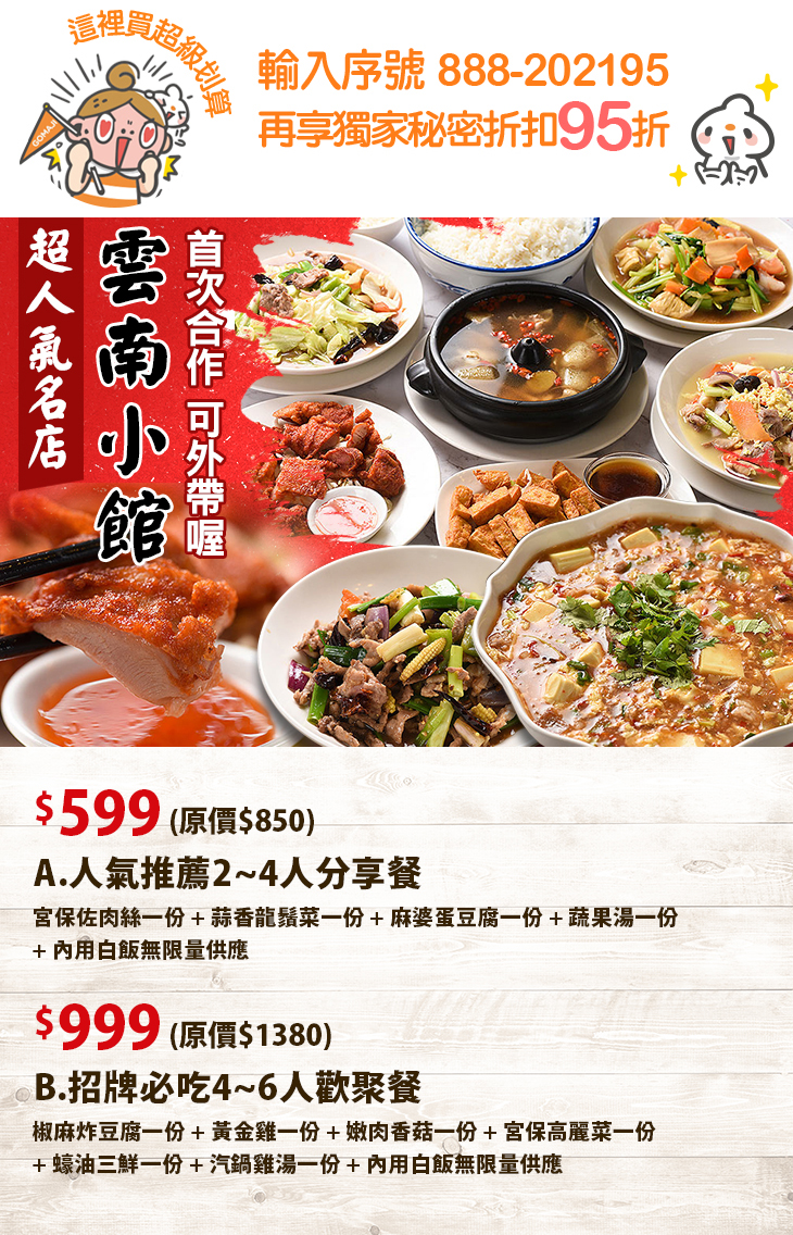 超人氣名店!首次合作!秉持用料實在、食材新鮮原則,樣樣都是店家遵循獨門配方、用心烹煮而成,為了完美展現風味道地的雲泰佳餚,保證每一口都能滿足您我挑剔的味蕾,宛如身處異地,帶著舌尖遨遊一場美食之旅;在這裡,不僅能讓您食得飽足又滿意,更安心無慮唷!