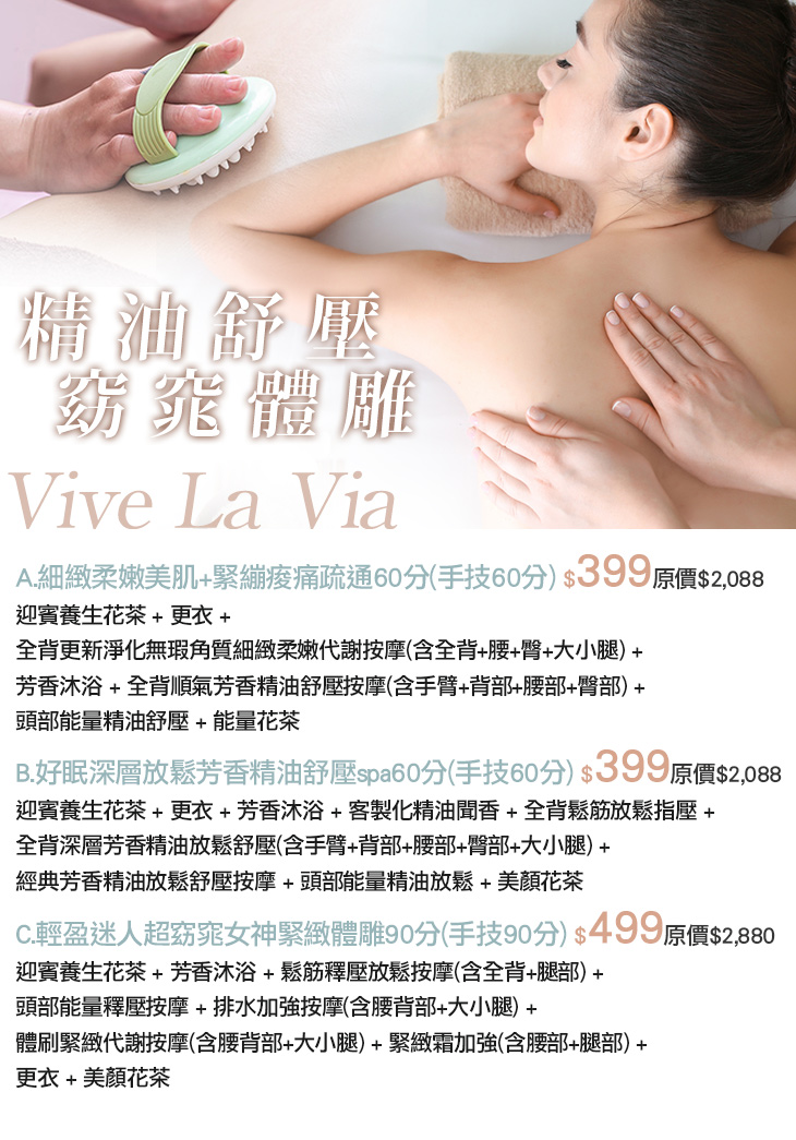 A.細緻柔嫩美肌+緊繃痠痛疏通60分(手技60分) / B.好眠深層放鬆芳香精油舒壓spa60分(手技60分) / C.輕盈迷人超窈窕女神緊緻體雕90分(手技90分)