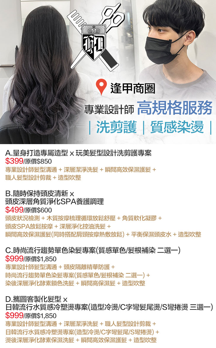 A.量身打造專屬造型 x 玩美髮型設計洗剪護專案 / B.隨時保持頭皮清新 x 頭皮深層角質淨化SPA養護調理 / C.時尚流行趨勢單色染髮專案(質感單色/髮根補染 二選一) / D.攜圖客製化髮型 x 日韓流行水質感冷塑燙專案(造型冷燙/C字彎髮尾燙/S彎捲燙 三選一)