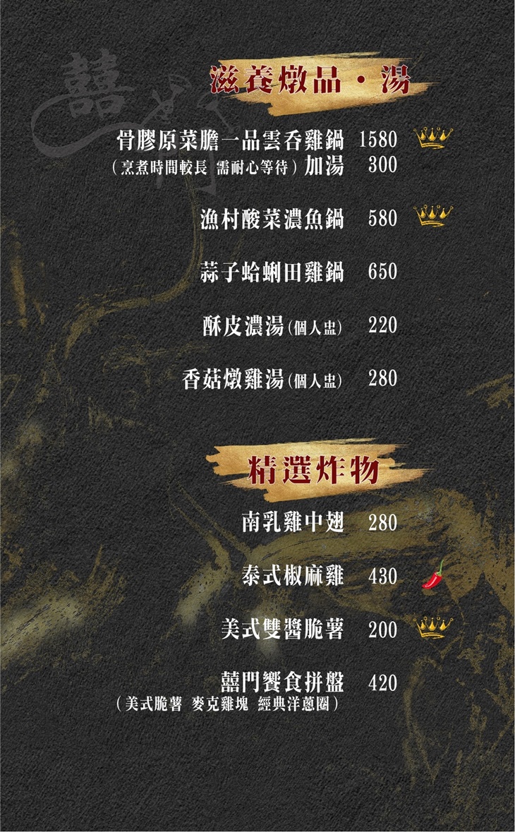 【囍門餐酒館】是一間中式風格餐酒館,古色古香的裝潢,配上小吃美食和特調酒飲,太幸福了吧~真是下班後小酌放鬆的好地方!新鮮用料、精緻擺盤、澎湃份量、絕佳風味,每一口都吃得出店家滿滿的用心和廚師精湛的手藝,期盼能帶給您難以忘懷的美食饗宴!今晚,就讓典雅復古的用餐環境,療癒您心中的疲憊;讓獨特美味的特色料理,撫慰您挑剔的味蕾吧!♥
