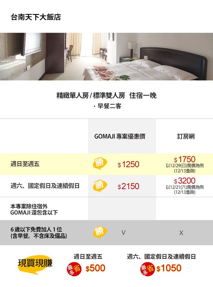 距台南火車站僅5分鐘的路程!於民國74年建立的【天下大飯店】,為台南地區老字號商務旅館,過去有許多名人來此入住過,更榮登來台南必入住的飯店之一。位置緊鄰赤崁樓、祀典武廟文化商圈,距離台南市最負盛名之國華街、石精臼小吃聚落亦在步行範圍內;地理位置優越、生活機能健全,是您停留台南作為旅遊、洽商、會議之最佳選擇!本次與GOMAJI聯合推出麻吉獨享超值優惠住宿方案,對台南的古蹟、文化、歷史充滿好奇嗎?對傳統道地又美味的小吃充滿熱情嗎?心動不如馬上行動,趕緊收拾行李,起身出發吧!