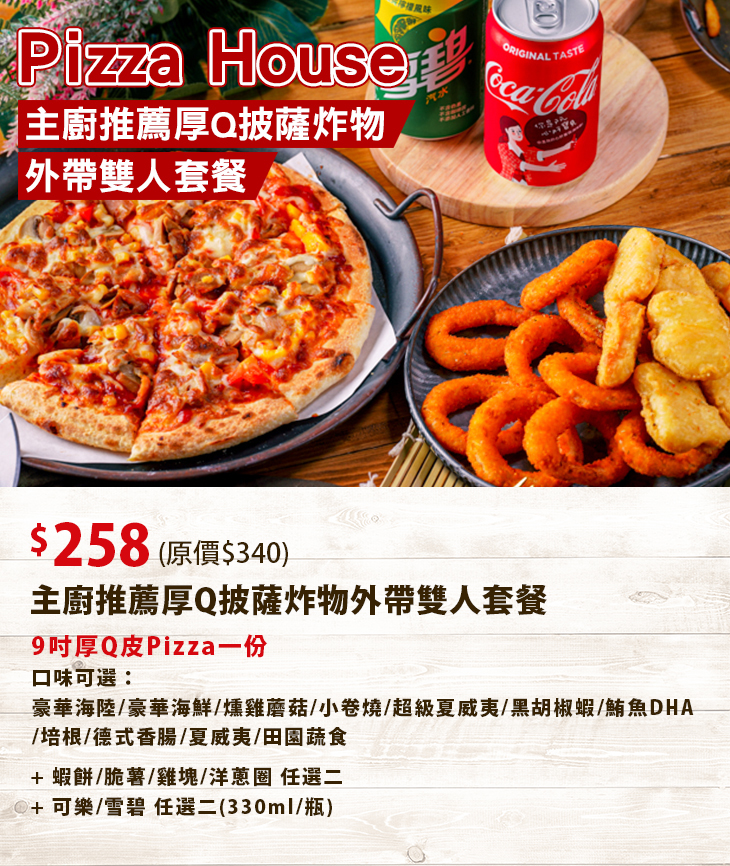 〈9吋厚Q皮Pizza一份(口味可選:豪華海陸/豪華海鮮/燻雞蘑菇/小卷燒/超級夏威夷/黑胡椒蝦/鮪魚DHA/培根/德式香腸/夏威夷/田園蔬食) + 蝦餅/脆薯/雞塊/洋蔥圈 任選二 + 可樂/雪碧 任選二(330ml/瓶)〉