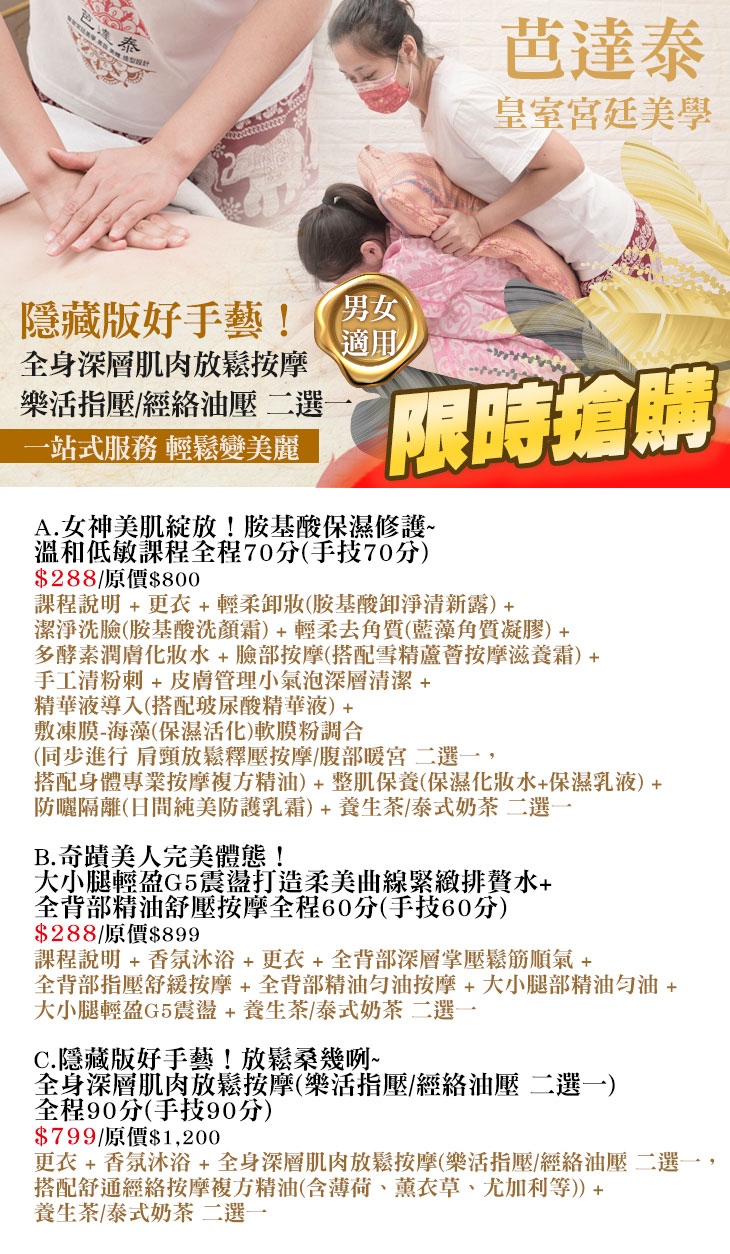 A.女神美肌綻放!胺基酸保濕修護~溫和低敏課程全程70分(手技70分) / B.奇蹟美人完美體態!大小腿輕盈G5震盪打造柔美曲線緊緻排贅水+全背部精油舒壓按摩全程60分(手技60分) / C.隱藏版好手藝!放鬆桑幾咧~全身深層肌肉放鬆按摩(樂活指壓/經絡油壓 二選一)全程90分(手技90分)