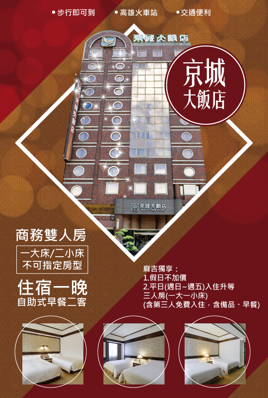 座落於高雄火車站後站出口正對面,交通便利!不論是從硬體設備到服務品質,始終以追求最高的客戶滿意度作為經營目標!從開幕至今,不斷加強員工訓練、提升員工素質,以客為尊的服務態度與親切誠懇的問候,滿足您住宿的需要,給您最好的住宿體驗!趁著悠閒假期,來到高雄遊玩,走訪港都各大知名景點,京城大飯店伴您共享樂遊南台灣的每一刻!