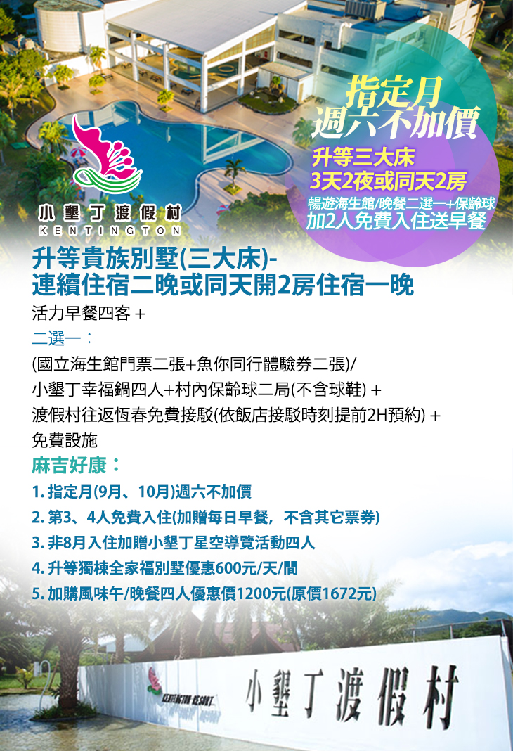 ★ 3天2夜或同天開2房!升等貴族別墅三大床超享受,第三、四人享免費入住送早餐!