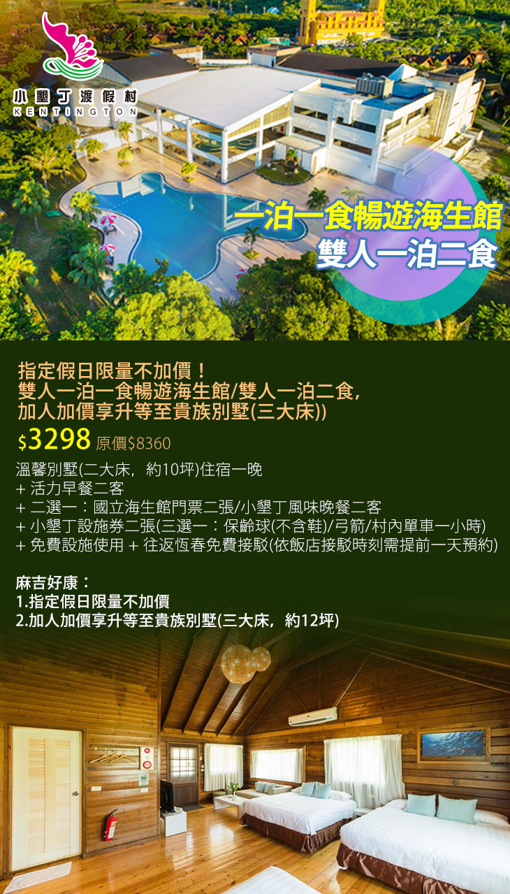 ★ 專案可選擇暢遊海生館欣賞多采多姿的海洋世界或是留在村內享用晚餐合菜,入住木屋房型,麻吉獨享加人加價享升等至貴族別墅(三大床,約12坪),真的超划算!