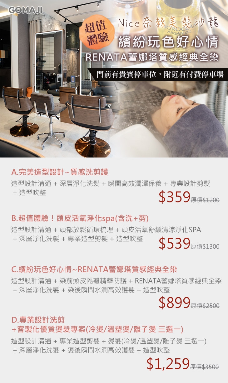 A.完美造型設計~質感洗剪護 / B.超值體驗!頭皮活氧淨化spa(含洗+剪) / C.繽紛玩色好心情~RENATA蕾娜塔質感經典全染 / D.專業設計洗剪+客製化優質燙髮專案(冷燙/溫塑燙/離子燙 三選一)
