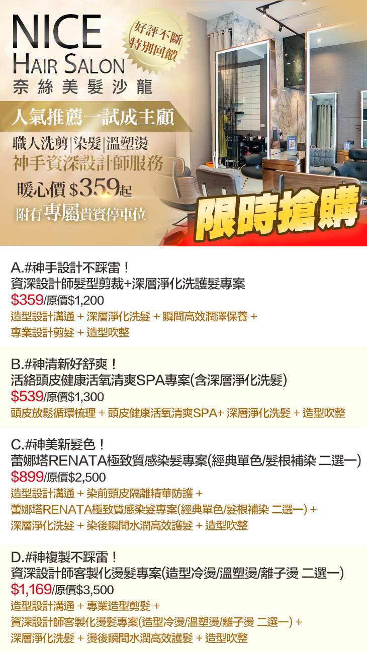 A.#神手設計不踩雷!資深設計師髮型剪裁+深層淨化洗護髮專案 / B.#神清新好舒爽!活絡頭皮健康活氧清爽SPA專案(含深層淨化洗髮) / C.#神美新髮色!蕾娜塔RENATA極致質感染髮專案(經典單色/髮根補染 二選一) / D.#神複製不踩雷!資深設計師客製化燙髮專案(造型冷燙/溫塑燙/離子燙 二選一)
