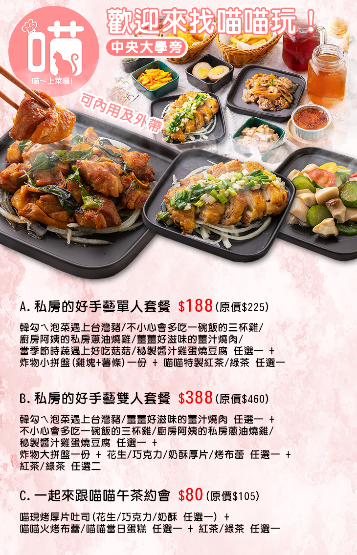〈韓勾ㄟ泡菜遇上台灣豬/不小心會多吃一碗飯的三杯雞/廚房阿姨的私房蔥油燒雞/薑薑好滋味的薑汁燒肉/當季節時蔬遇上好吃菇菇/秘製醬汁雞蛋燒豆腐 任選一 + 炸物小拼盤(雞塊+薯條)一份 + 喵喵特製紅茶/綠茶 任選一〉