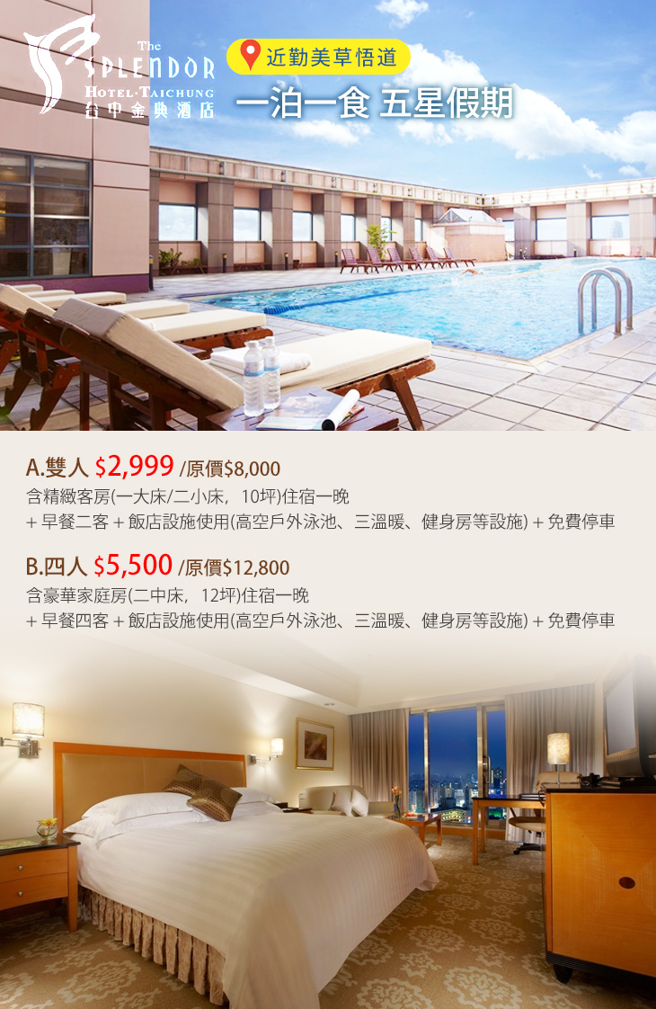 ★ 台中五星度假住宿首選,在這裡可以使用飯店休閒設施:高空戶外泳池、三溫暖、健身房等,待在飯店即可享受悠閒的時光。