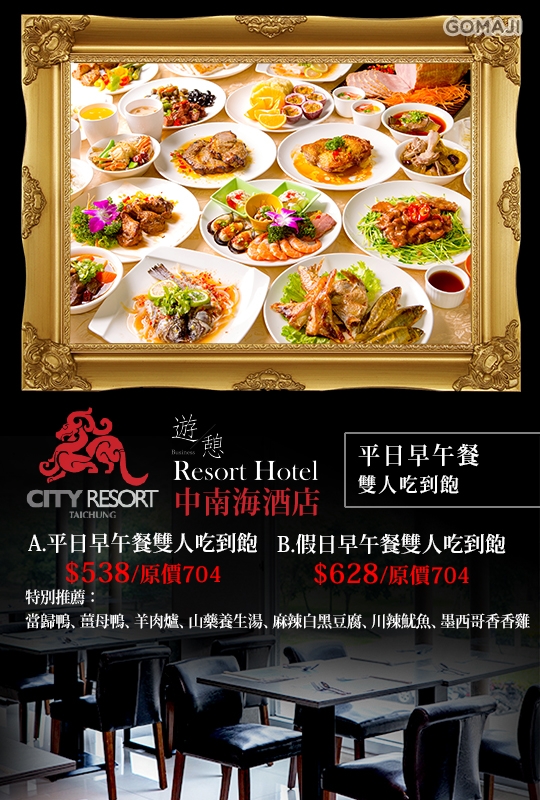 只要538元起(雙人價),即可享有【中南海酒店】A.平日早午餐雙人吃到飽 / B.假日早午餐雙人吃到飽