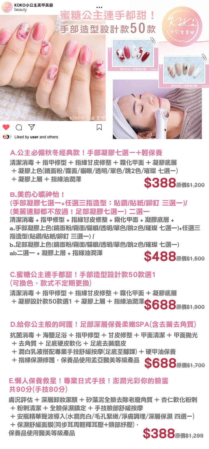 A.公主必備秋冬經典款!手部凝膠七選一+輕保養 / B.美的心曠神怡!(手部凝膠七選一+任選三指造型:貼鑽/貼紙/鉚釘 三選一)/(美麗連腳都不放過!足部凝膠七選一) 二選一 / C.蜜糖公主連手都甜!手部造型設計款50款選1(可換色,款式不定期更換) / D.給你公主般的呵護!足部深層保養柔嫩SPA(含去繭去角質) / E.懶人保養救星!專業日式手技!澎潤光彩你的臉蛋共90分(手技80分)