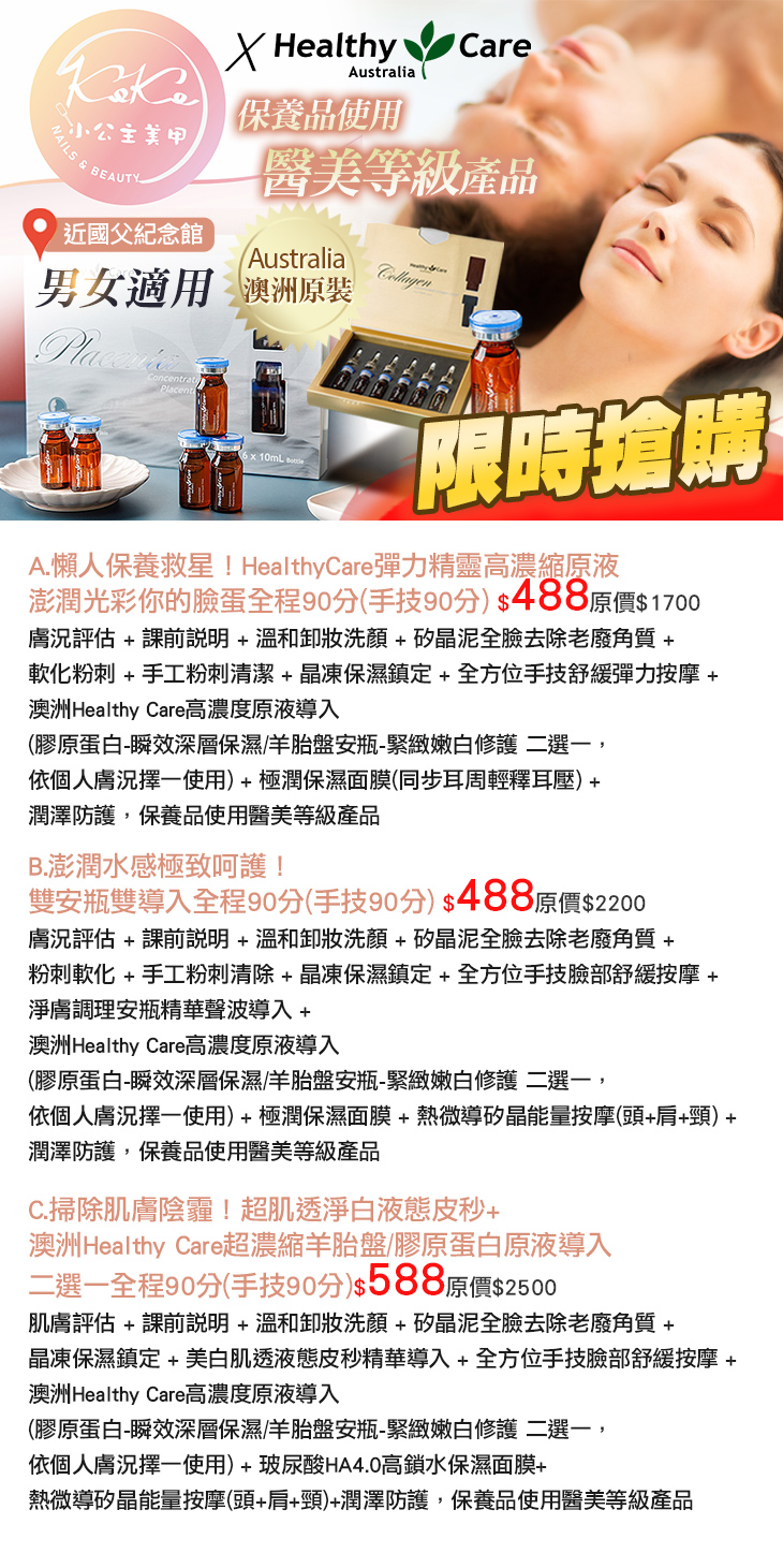 A.懶人保養救星!HealthyCare彈力精靈高濃縮原液澎潤光彩你的臉蛋全程90分(手技90分) / B.澎潤水感極致呵護!雙安瓶雙導入全程90分(手技90分) / C.掃除肌膚陰霾!超肌透淨白液態皮秒+澳洲Healthy Care超濃縮羊胎盤/膠原蛋白原液導入 二選一全程90分(手技90分)