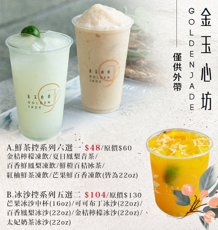 揀選品質上等的茶葉,搭配時令新鮮的水果,或者來自優質乳源的鮮奶,【金玉心坊】用心手製一杯又一杯風味細膩、百喝不厭的精品茶飲!嚴選原物料,經由秘方配方調配,恰到好處的比例,調和出專屬於品牌的魅力,喝起來就是和一班坊間的很不一樣!在這人手一杯手搖茶飲的時代,當然要來一杯【金玉心坊】!