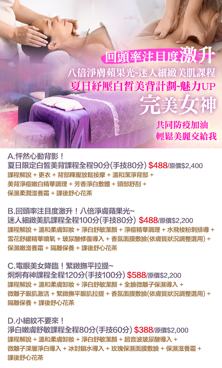 A.怦然心動背影!夏日限定白皙美背課程全程90分(手技80分) / B.回頭率注目度激升!八倍淨膚蘋果光~迷人細緻美肌課程全程100分(手技80分) / C.電眼美女降臨!緊緻撫平拉提~炯炯有神課程全程120分(手技100分) / D.小細紋不要來!淨白嫩膚舒敏課程全程80分(手技60分)