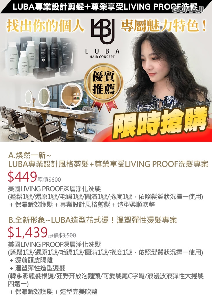 A.煥然一新~LUBA專業設計風格剪髮+尊榮享受LIVING PROOF洗髮專案 / B.全新形象~LUBA造型花式燙!溫塑彈性燙髮專案