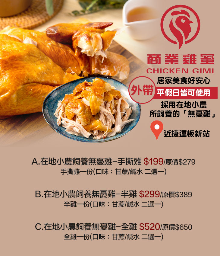 專賣甘蔗雞、鹽水雞…等雞料理的【商業雞蜜-無憂雞專賣店】,美味可是蘊含「商業機密」!特別採用在地小農所飼養的「無憂雞」調理,在純淨、自然環境中孕育的雞隻,肉質飽滿,富有彈性,鮮度絕佳!搭配秘方工法與調味,烹調成香氣醇厚,帶有甘蔗清甜的甘蔗雞,或者脆皮清爽、鹹濃滋味恰到好處的脆皮鹽水雞,口味不同,但都充份展現出新鮮雞肉的美好,把好食材的美味發揮得盡善盡美,讓您品味前所未嚐、齒頰留香的雞肉料理!