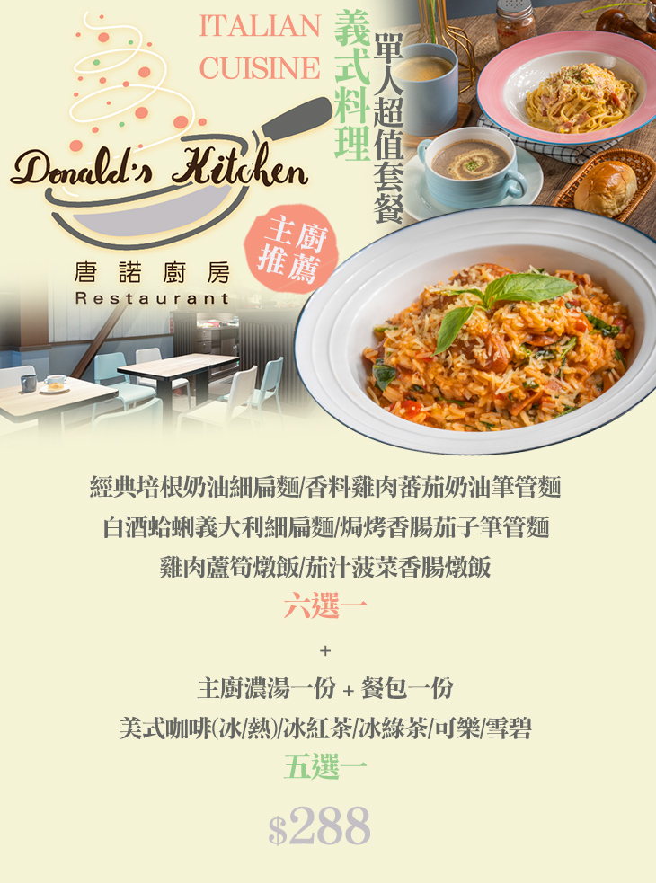 ★ 主廚推薦義式料理單人超值套餐