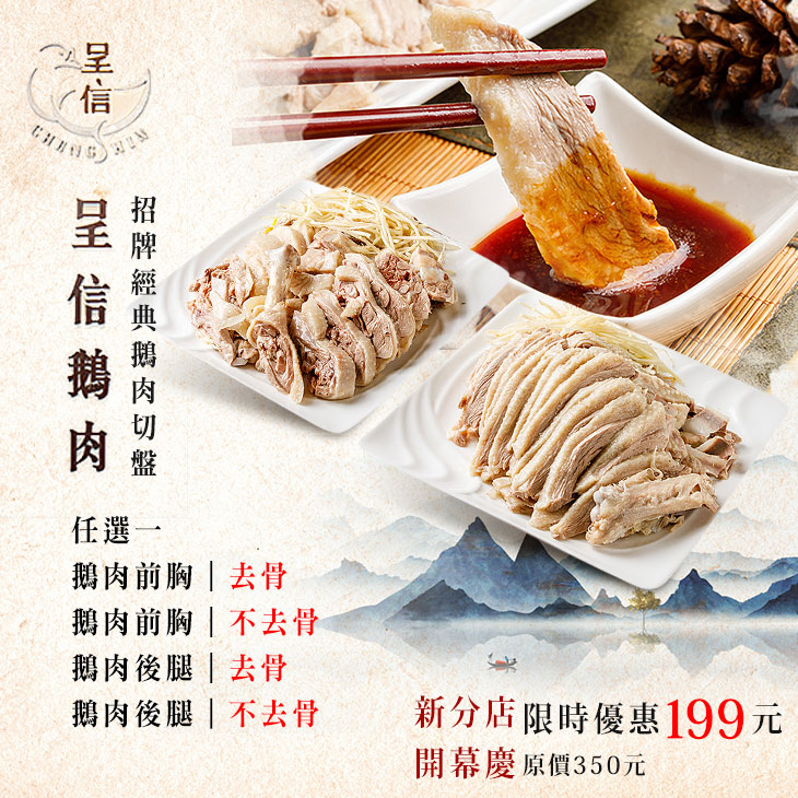 謹守品質,是【呈信鵝肉】的核心理念,職人永不變的講究、蘊含其佳餚中的功夫,將最簡單的以平民美食的型態獻上,讓每一位顧客,都能以樸實的價位,享用豐盛、可口的鵝肉料理,將傳統的鵝肉美食文化傳遞出去,於您我的味蕾留下美好的記憶。