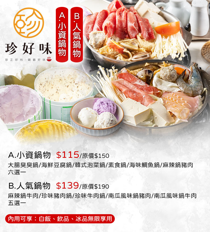 經過店家嚴選的海鮮食材,搭配Q彈軟嫩的豆腐、香滑細緻的豬肉、新鮮脆甜的蔬菜等多種配料,只為了把最好的品質親自送到您口中,有肥嫩紮實的鮮蝦、彈嫩鮮美的魷魚、飽滿多汁的蛤蜊等,樣樣品項煮入風味鍋底之中,將來自海洋的甜美精華通通融於湯頭裡,散發陣陣宜人的鮮香,更襯托整體鍋物的鮮甜及甘美,每一口都好銷魂,輕輕撫慰著您的味蕾,為這一頓餐畫下完美的句號。